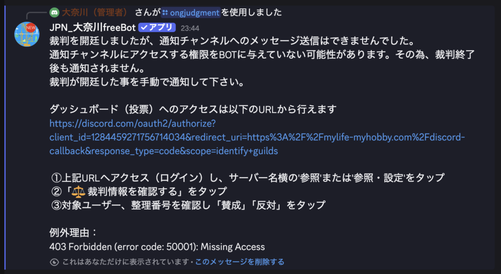なお、裁判開廷権を有さないユーザーが実行すると以下のメッセージを返し、裁判は開廷されません。