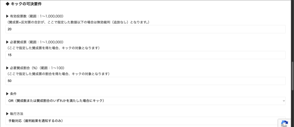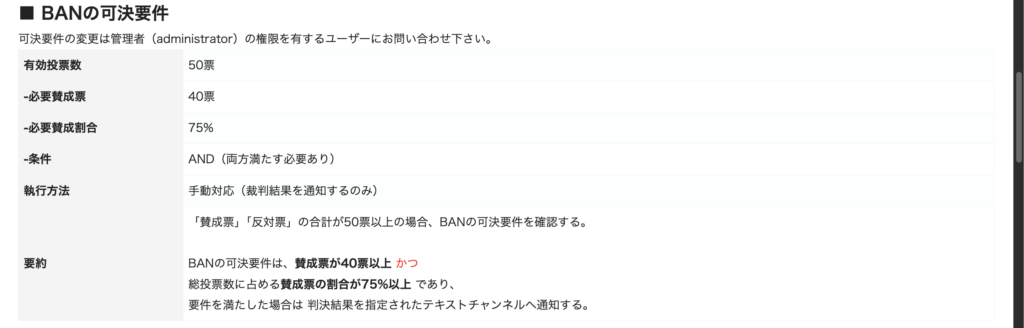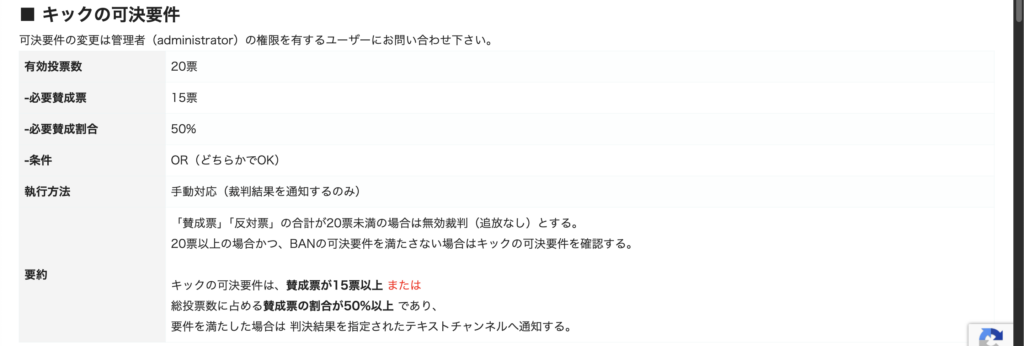 - BANの要件を満たさない場合は、賛成票が15票以上のためキック対象