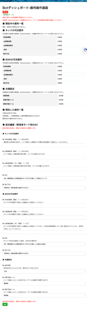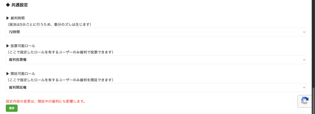 - 上述で説明したロール(裁判投票権)のロールを指定します。ここで指定したロールを有するユーザーのみ裁判で投票が可能となります。