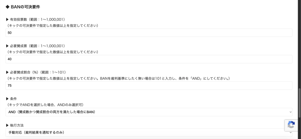 続いてBANに必要な要件を定義します。定義する項目はキックの可決要件と同様です。