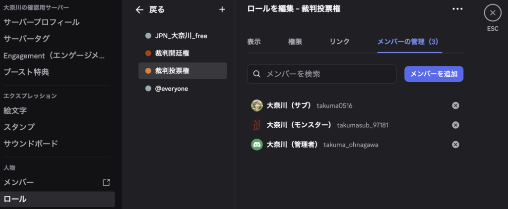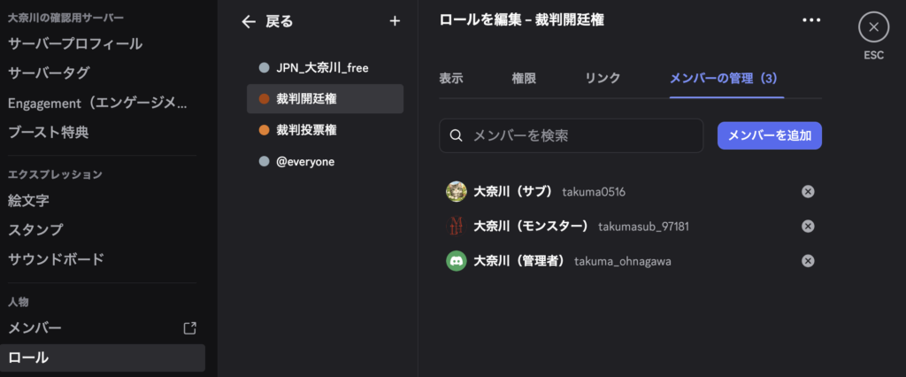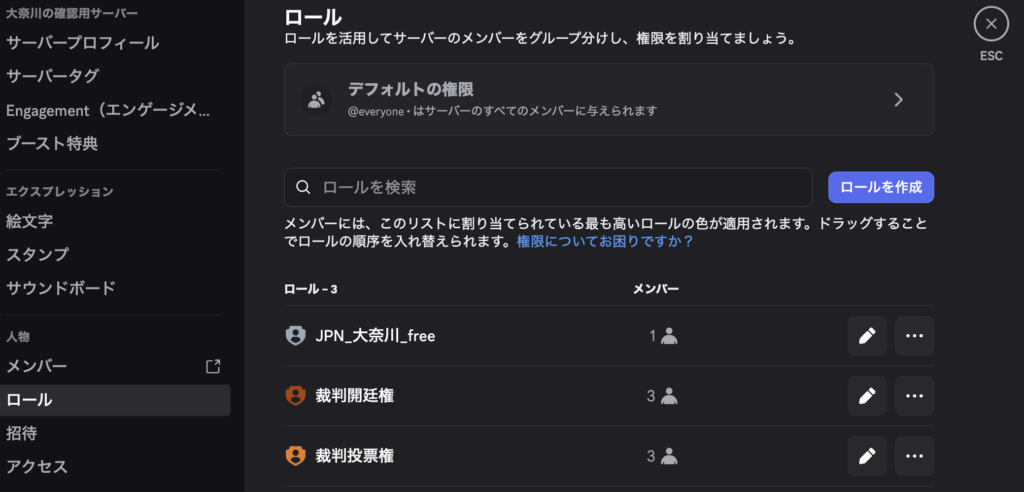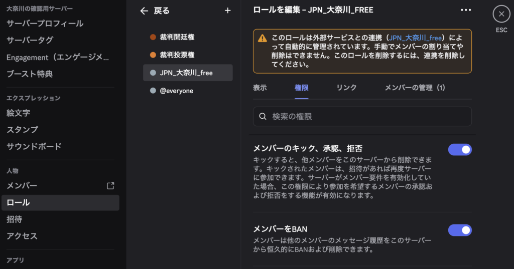 上図のように、「JPN_大奈川_free」ロールが上位にある場合かつ、被告が管理者でない場合はキック・BANを行うことが可能となります。