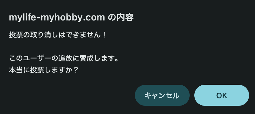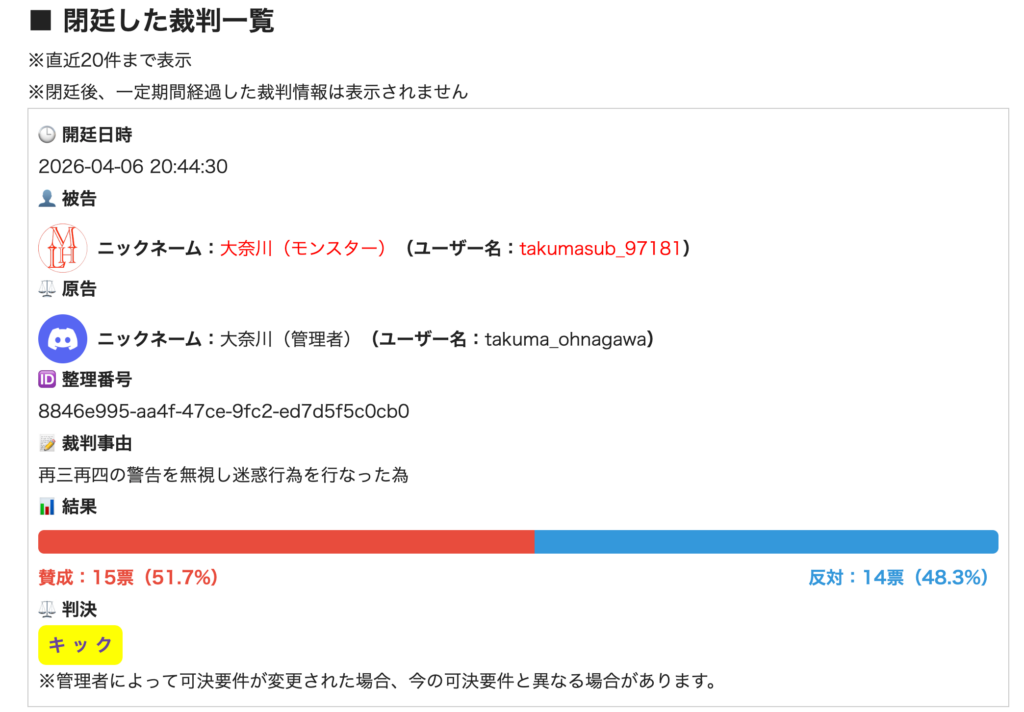 この票数の場合、賛成率と賛成票数共にキックの可決要件を満たしている為、このまま裁判が終了すれば被告のユーザーはキックの対象になります。