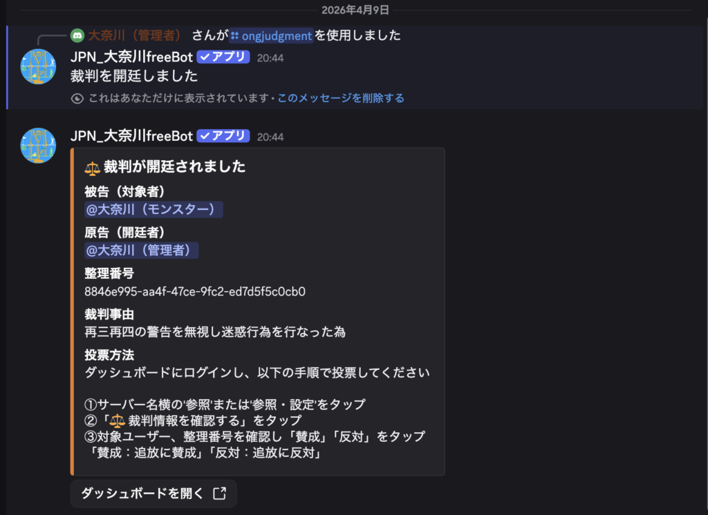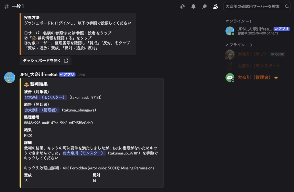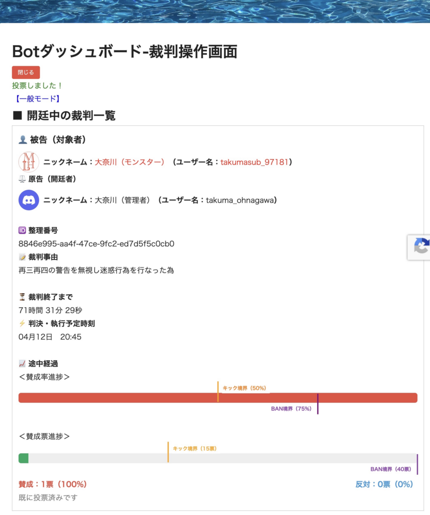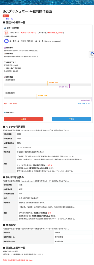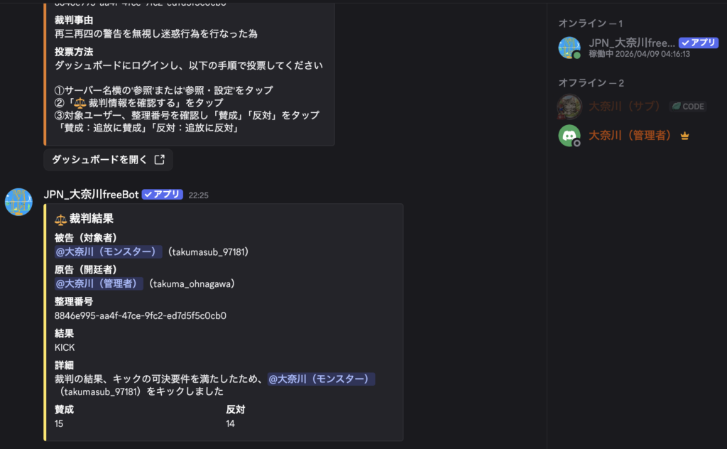 - 一定時間後に裁判結果を通知(場合によってはキック・BANも同時にBOTが執行)
