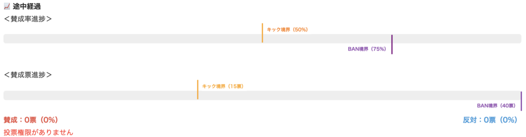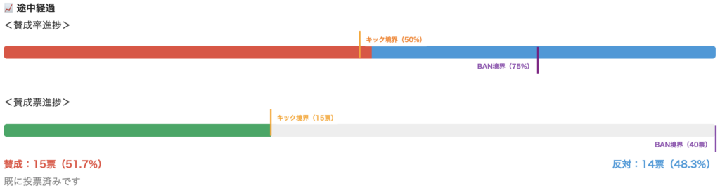 キックの可決要件の条件が AND かつ、今後反対票が多く入れば賛成割合が50%を下回ることになり無罪となります。逆に賛成票が増えればBANの可能性も見えてきます。