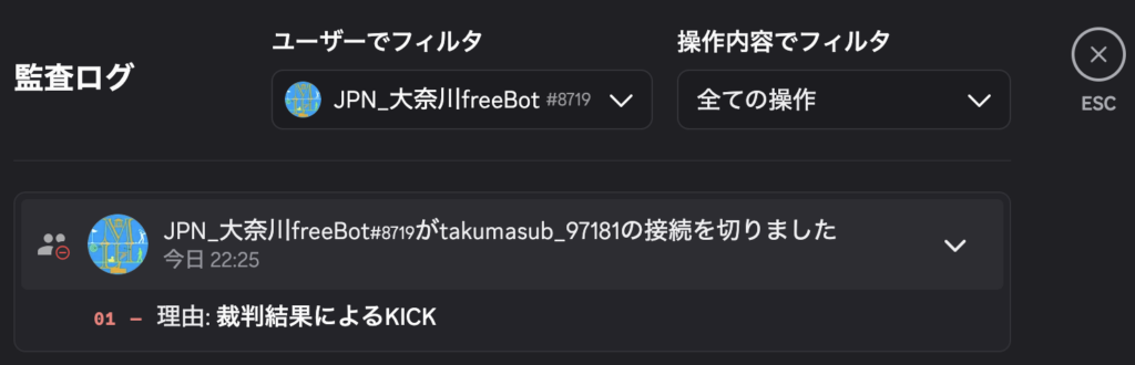 が適切の場合、BOTが自動でキック・BANを行います。なお、監査ログに書き込まれるキック・BANの理由は下図の通り