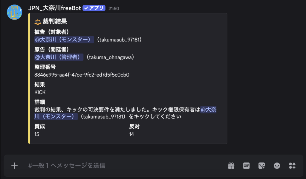 まず、通知チャンネルへ裁判結果を以下のような形で通知します。