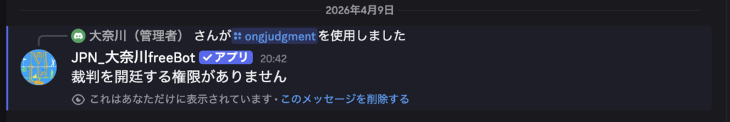 なお、裁判開廷権を有さないユーザーが実行すると以下のメッセージを返し、裁判は開廷されません。