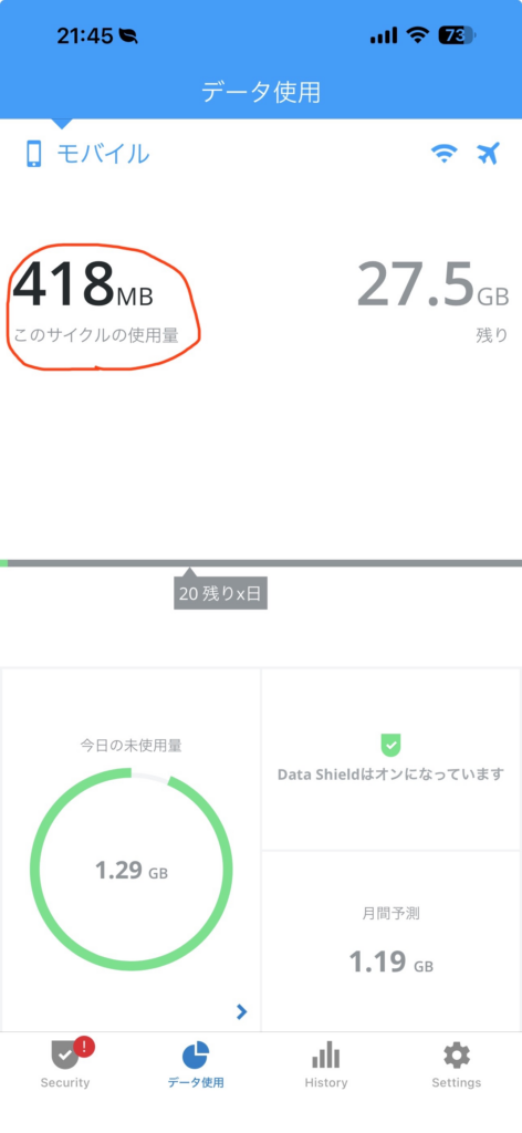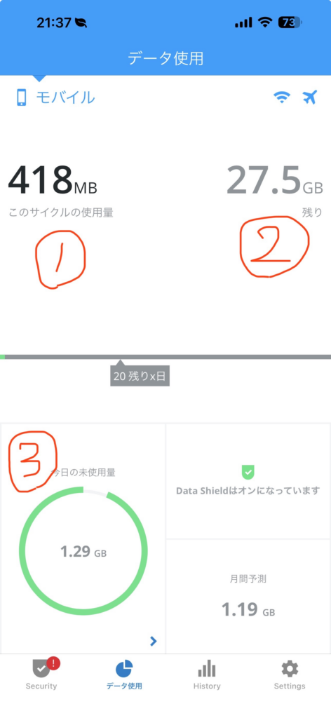 - (赤丸の②):今月の残データ通信量