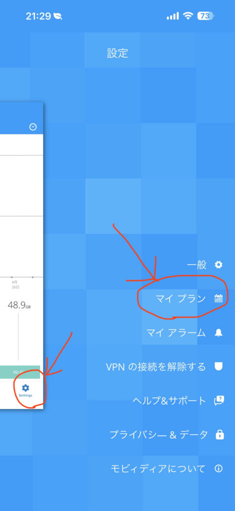 設定をタップしマイプランへ